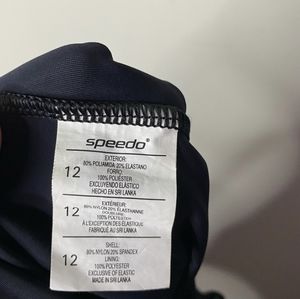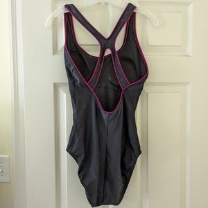 Black Speedo Ultraback one piece swimsuit with pink trim. One small spot of thinning fabric on the back (pictured) but otherwise great condition.