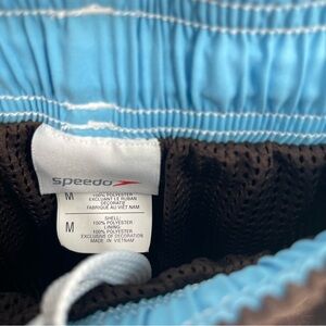 Speedo Water Shorts Size M Men Speed Dry Swim NWT Summer Water Trunks Boardshort. Polyester with polyester lining. Brown blue white. Elastic drawstring waist. Water repellent. 2 outer and 1 inner pocket. Waist 29. Inseam 10. Measurements are approximate. New.