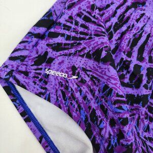 Designed for confident swimmers, this Speedo one-piece swimsuit offers a blend of style and functionality. Its vibrant purple and black print, combined with a supportive padded bra and V-neck design, ensures both comfort and performance in the water. Ideal for regular swim practices or leisure swimming.