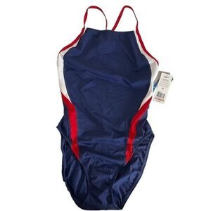 Speedo Navy Endurance + Launch Splice One Piece Swimsuit. Navy blue, red and white colors.