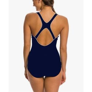 Speedo Women's Size L One Piece Swimsuit Dark Blue Sporty Keyhole Racerback