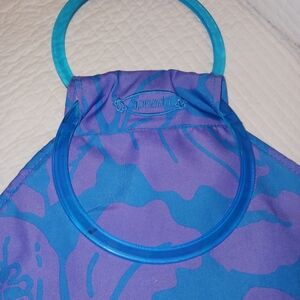 This is a Y2K Speedo swim tote with beautiful blue and purple hibiscus print and clear blue acrylic handles. It has a small pouch inside. Sturdy but soft fabric with colors so vibrant they're eye candy! photos don't do it justice. Love this bag!