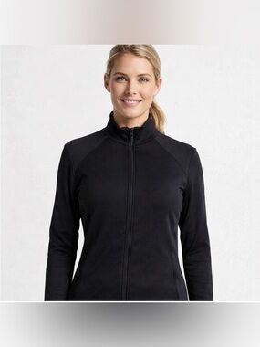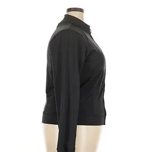Lightweight black Speedo zip-front jacket made from PowerFLEX Eco performance fabric. Features a sleek, fitted silhouette with long sleeves, a mock neck collar, and a smooth, stretchy feel for comfortable movement. Designed to be breathable and quick-drying—perfect as a swim cover-up, workout layer, or athleisure piece. Minimalist and versatile, ideal for active or casual wear.