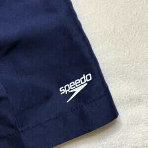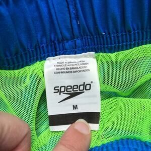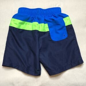 Speedo navy blue green striped boys swim trunks. Size Medium. Excellent preowned condition.
