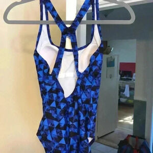 Speedo racer back one piece bathing suit. From top of strap to bottom of suit is 25”.
