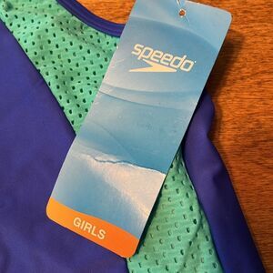 NWT! Featuring a dynamic blue and green color-block design, it offers a sporty look with high-cut leg openings and a round neckline. Ideal for swimming, this suit ensures comfort and flexibility with its durable material.