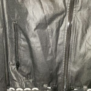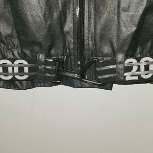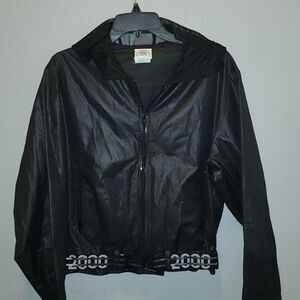 lightweight black zipper front windbreaker has 2 front zipper pockets mesh hood belt looped waist closure