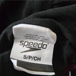 Elegant Speedo one-piece with a sleek black and dark red design. Ideal for swimming with style and comfort.