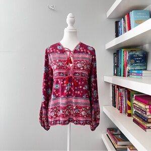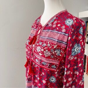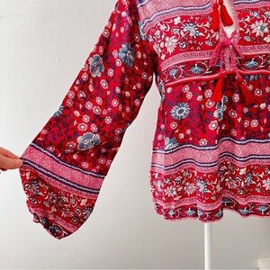 Beautiful boho spell vintage vibe blouse in very good preowned condition. This beautiful Spell blouse is the perfect addition to your wardrobe. The V-neckline and tie closure add a touch of elegance, while the tasseled accents and lightweight fabric make it perfect for summer and spring. The long balloon sleeves and red color give it a playful and bohemian goddess look.