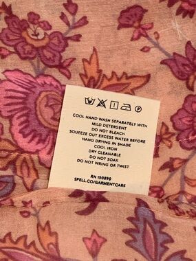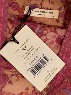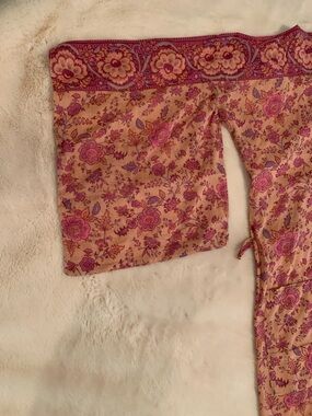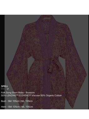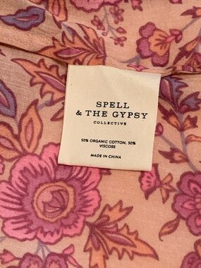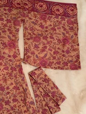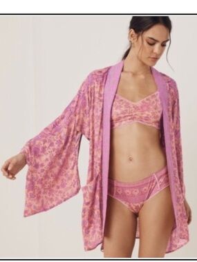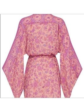 Spell Folk Song Robe/Duster in Blossom features bohemian floral print in earthy shades of pink and lavender, two front pockets, slit underarm for comfort, and removable tie for waist.