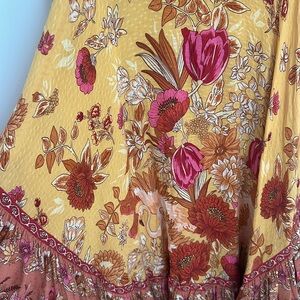 Chic high low dress by Spell. Features vibrant floral patterns. Ruffled neckline and hem. Perfect for a stylish look. Missing belt