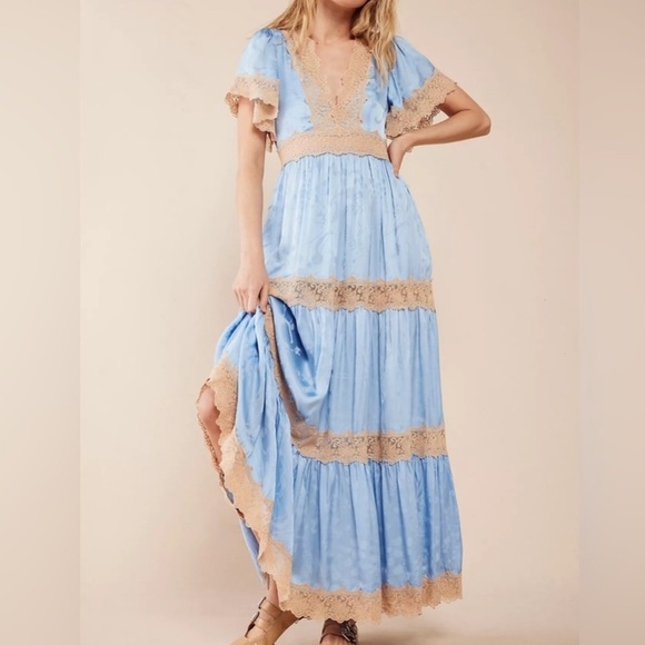 Spell and the Gypsy Collective x Free People featured in a silky fabrication with tiered bottom and exaggerated lace trim throughout for an added vintage design.