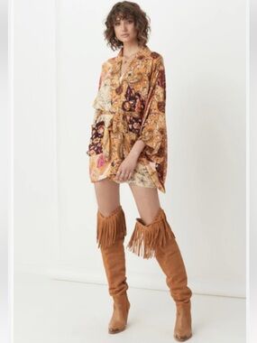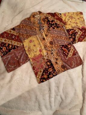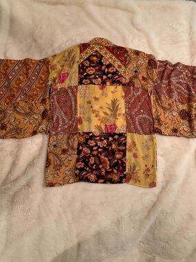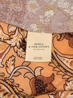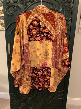 Spell Renew Patchwork Robe/Duster in Amber features various Spell prints leftover from collections past carefully places into this beautiful piece. Iconic split underarms for comfort, two front pockets, and waist tie. Each one is unique. Irl photos available in this listing. Only worn once. Like new.