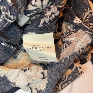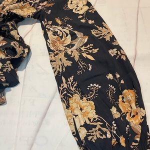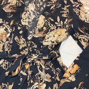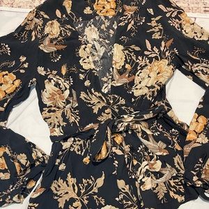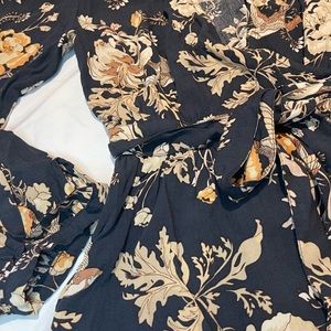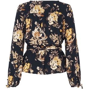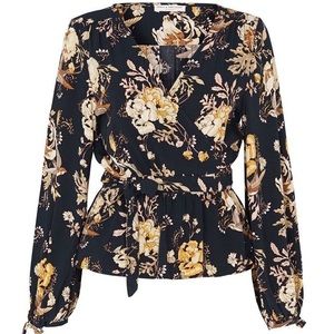 Wrap Blouse in color coal with soft florals and billow sleeves, a fixed cuff and a wrap at the waist. Can tie at the back or to the side. Can also be dressed up or down when paired with jeans for a day look. New without tags.