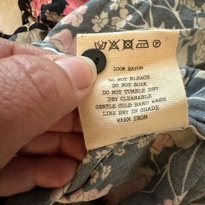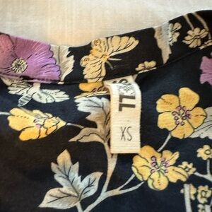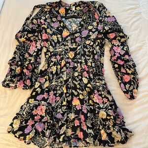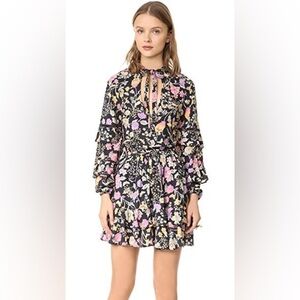 Flutter sleeve mini dress in Nightshade floral print from Flower Child Correction V neck with tie ( can be worn untied or tied) Button under V neck Ladder trim on the back Layered frill skirt