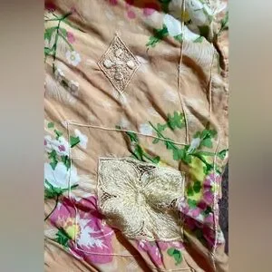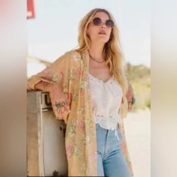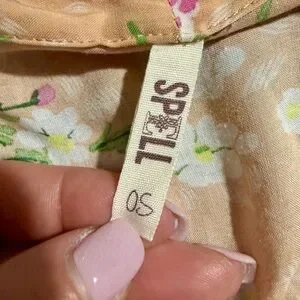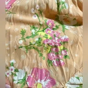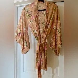 Lightweight short robe with tie featuring a vintage inspired floral pattern on a blush background. Marked one size O/S, this will fit many sizes comfortably. This is an older piece and has been worn, however has no visible signs of wear, it just needs a good steaming.