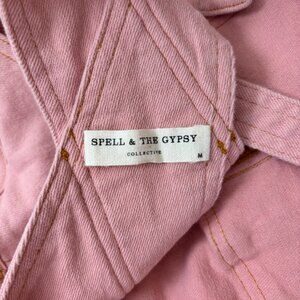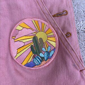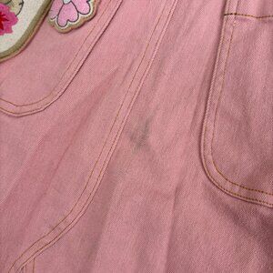Adorable pink pinafore overalls with patch details and adjustable cross-over straps. Light marking on the back pictured. Priced as marked .