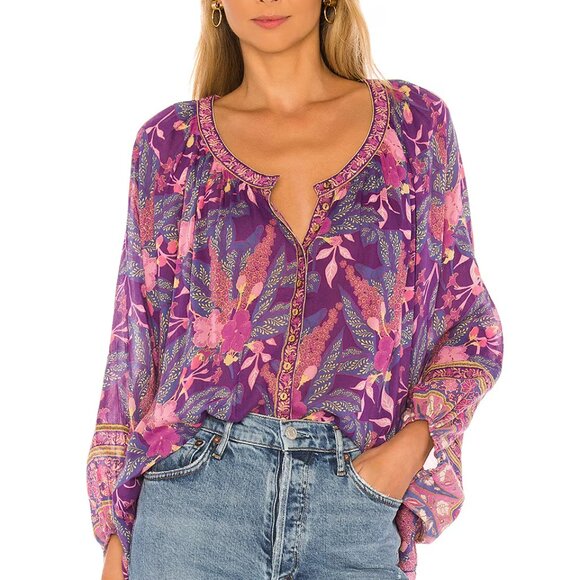 Spell & The Gypsy Collective Bianca Blouse in Wisteria Size XS - excellent preowned condition, light wear, no major flaws. Cotton blend materials. Partial front button closure, buttons down the front, elasticized long sleeve slight puff sleeves. Lightweight flowy, semi-sheer material. Revolve style. Comes with extra button on tag. Printed blouse. Exaggerated sleeves. A oversized style fit. Rounded neckline with button at the center, can be buttoned all the way up to the neckline or left open. Colors of the Wisteria are purple, pink, lilac, brown, yellow, blue, and green. Gorgeous leaves and flowers all over. Boho, bohemian chic. Coconut buttons down the front. Statement piece. Casual, work attire, or formal.