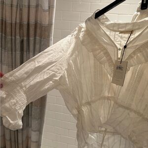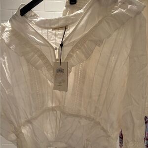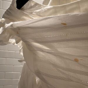 Skirt set new never wore. The skirt is a large and the top is a 2X however, the top runs extremely small. I would say it’s more like a large however the blouse came with marks I have not tried to get them out. They are on the top right arm, other than that perfect white.