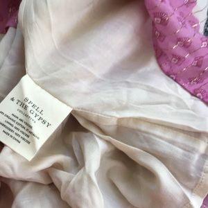 Spell X Free People coco lei floral embroidered pink tunic dress. Elasticized sleeves, lined, and tassels with bells at the neckline. A loose strand of lurex and one run pictured, but great condition otherwise.