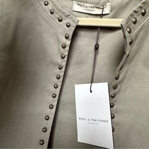Beautiful, open fronted stud and embroidered detailing, 100% cotton, besides the studs and the embroidery. A great juxtaposition between its army green and kind of army jacket with the matinee and the boho nature of the incredible Spell brand. Eye catching, beautiful hand detailing cinch waist and goat paneling makes this a perfect least structured jacket that will last for a very long time. Flare flares out behind, not so much to the sides. It starts towards the back. It is extremely flattering. Good luck and happy shopping and feel free to ask any questions and I will get to them as soon as I can! If I don’t answer right away, just tag me in the comments. ❤️❤️❤️❤️🌟🌟🌟🫶🏼🫶🏼🫶🏼🫶🏼🫶🏼