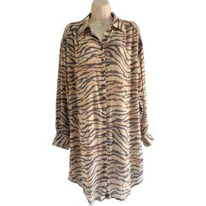 Spell & The Gyspy Collective Banksia Shirt Dress. Dress is a lightweight button up. Very oversize and semi sheer. The pattern is called "Animale" and it's gray and light orange in colour. Dress is made of an organic cotton viscose blend and is a woman's size XS. Org. list price $200.