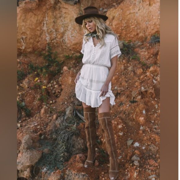 Hanging Rock is much sought after and hard to find! Antique white color, not actually bright white but that’s most whites in Spell (their lighting makes the whites appear brighter than they are) elastic waistband with tasseled rope ties. Ruffled tiers and real side pockets are delightfully feminine and lined. This dress is a work of art! Worn twice, no flaws