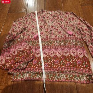 Spell Kombi Spice , floral print Blouse with Balloon Sleeves in a beautiful shade of pink. This blouse features a relaxed fit , fabric buttons with a V-neckline and long balloon sleeves with pink tasseled accents.