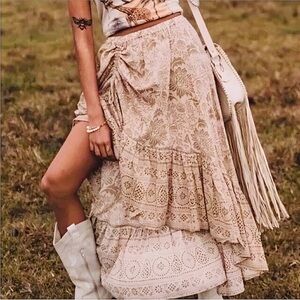 The beauty of the lioness skirt is very unique. It is unique in its style, with rouched details, a unique gorgeous neutral palette with tone on tone sophistication, it has a cast away feel with its high-low cut, and its rouching adds a French provincial feel. You can imagine wandering through fields of sunflowers with mountains and a castle far away, almost in the clouds. You spin and the skirt opens into a beautiful spiral, one with the landscape. You are home.