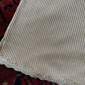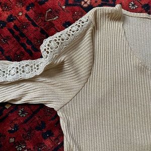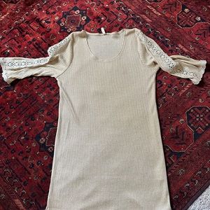 Knit mini with gold dust shimmer and metalic lace details, crochet along and down the sleeves as well bottom hem. Dressing unlined and has slight stretch to the fabric. Hangs straight.
