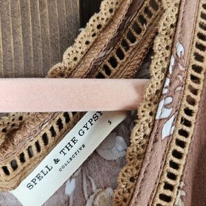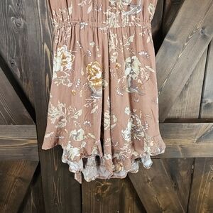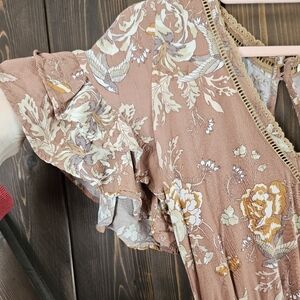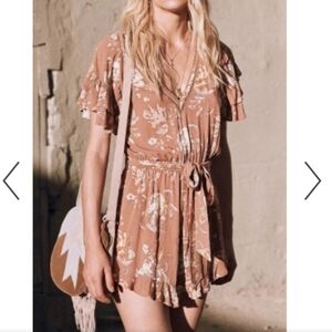 Description: Spell & the Gypsy Collective Rosa Floral Playsuit Romper Camel Brown Belted Small Flutter sleeve with ruffle. V-Neck, Cut out ladder detail, elastic waist, keyhole cut out, In excellent preowned condtion.