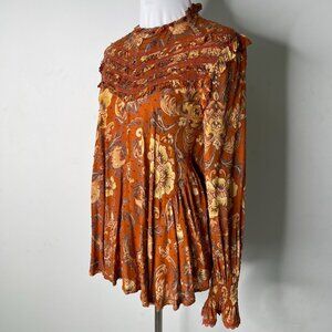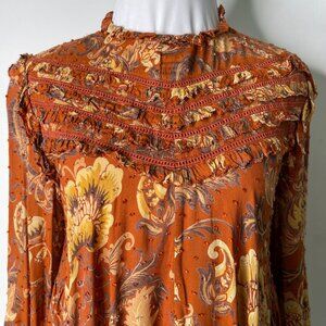 TAGS: Ruffle, Boho, Festival, Bohemian, Orange Tan, Long Sleeve, Top, Size Small.