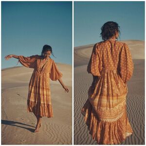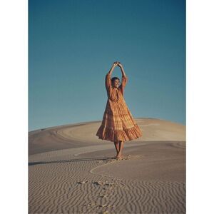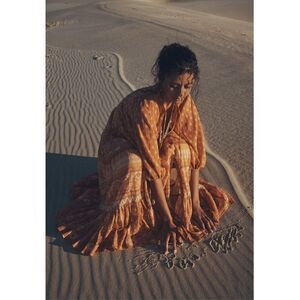 The stunning Utopia gown in a rich earthy Orange colorway features floral motifs and geometric borders, recreating the wild paradise that inspired this story. Multiple tiers cascade down the body for a full and voluminous flow, and coconut buttons down front allow this baby to be unbuttoned and styled any way you see fit. Functional ties at the neckline and arm cuffs end in corozo beads. Lined to tier of skirt. In good condition. No holes, rips, or stains. Ours is a smoke free home.