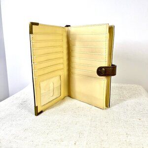 • FLAWS: Some gold foil trim came off from wear. Two nicks on inside of wristlet card slots, crack under snap closure. (Please see pictures) Item is priced accordingly.