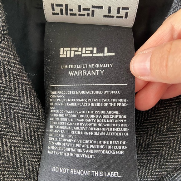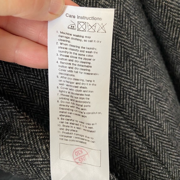 50% wool, pockets with flap on front, 3 hidden button closure, 3 buttons on sleeves, lined.