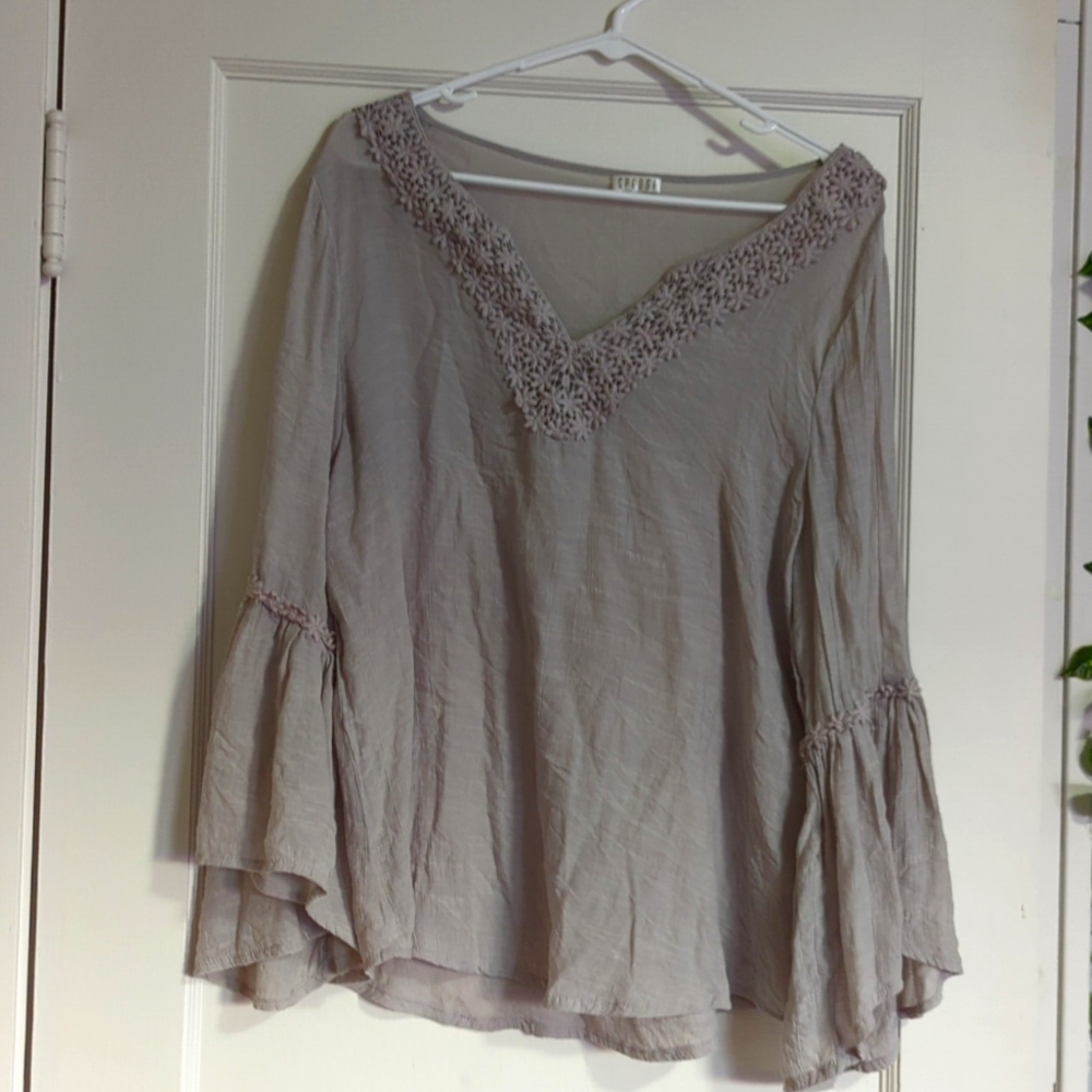 Open bell type sleeves flower accent designs No size on shirt Fits smaller/medium