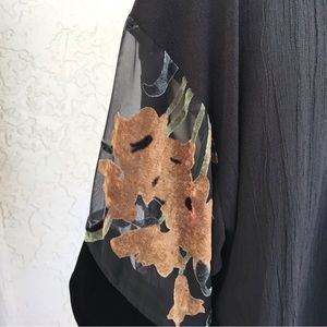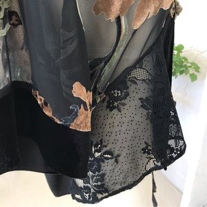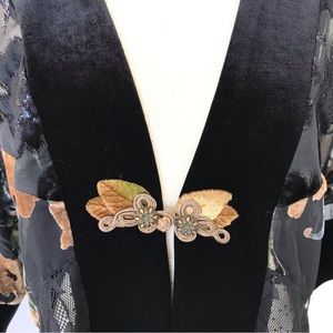 Vintage kimono has a velvet burnout floral in tan, green and black with sparkle, has small removable shoulder pads, velveteen front trim and on sleeves, front lace panel and a solid back, gold braid toggle with Bejewelled button, on back U/A to U/A 23.5” and length in back 25”, in excellent condition with no flaws…