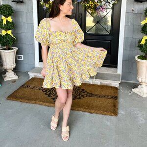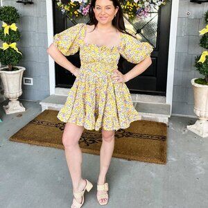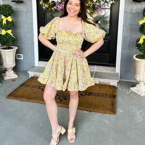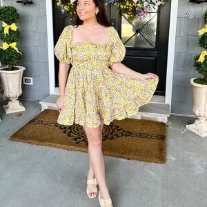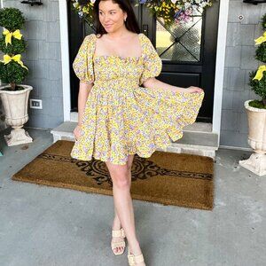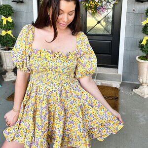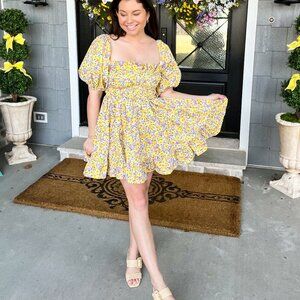 This Spencer Sunny Hunny Mini Dress features a beautiful dainty yellow floral print that is perfect for sunny days. Its ruffles and puff sleeves add a fun and feminine touch to the overall design. Stay stylish and comfortable with this delightful dress.