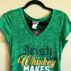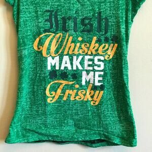 Details: “Irish Whisky Makes Me Frisky” sheer lace back short sleeve t-short sexy four leaf clovers