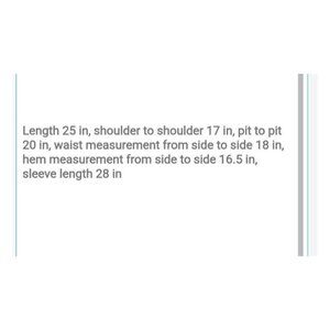 Length 25 in, shoulder to shoulder 17 in, pit to pit 20 in, waist measurement from side to side 18 in, hem measurement from side to side 16.5 in, sleeve length 28 in