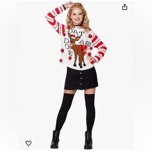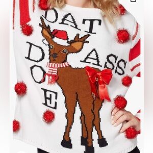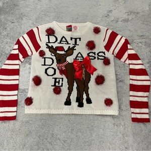 Spencer’s Holiday Ugly Christmas Sweater Dat Ass Doe Funny Edgy Pun Pom Poms Sz Small