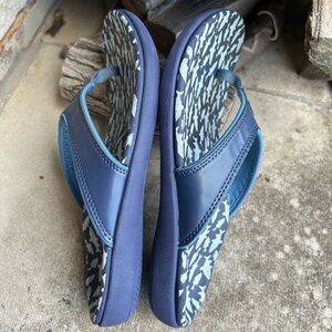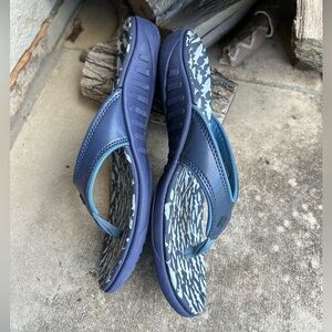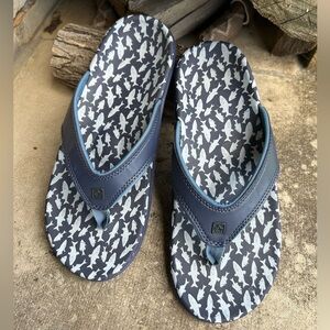 Spenco Orthotic Grade Arch Support Stylish navy flip flops with a fish patterned sole. Water resistant sandal. Pre owned in like new condition.