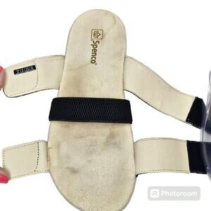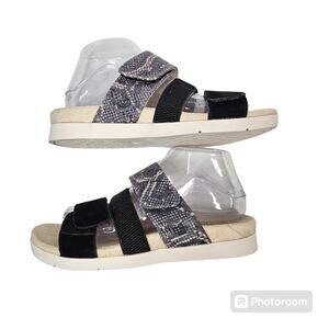 This is a pair of Spenco Total Support Tessa Sandals in Black Snake in a Women's Size 8B. They are in EUC, and the only issue is that there are signs of light wear on the inside of the right insole - see photos. Other than some spots on the light suede on the footbed, the sandals are in excellent condition.
