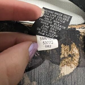 Spense Black and Beige Sheer Sleeveless Blouse. Stylish sleeveless blouse. Ruffled front detail. Tie on the neckline. Abstract black and beige pattern. Hidden zipper on the side. Size Large.