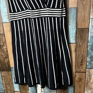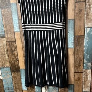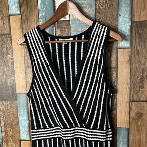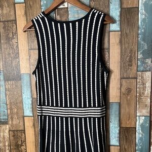 Chic mini dress with bold black and white stripes. Sleeveless design with a flattering fit.