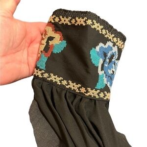 Pretty black, semi sheer, pleated blouse with floral Rose embroidery on Sleeve cuffs