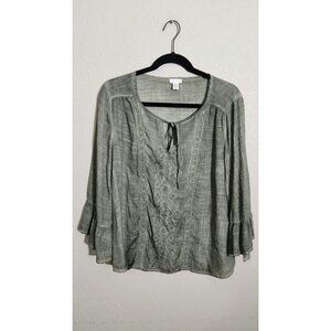 Spense Blouse Womens Large Green Embroidered Boho Peasant Top 3/4 Sleeve Tie Detail