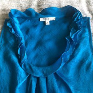 Spense ruffle shell in a beautiful blue pebbled satin fabric. Lovely drape. Scoop neck. Slight lettuce bottom edge. Slight high-low, back is 1 ½“ longer than the front. Size Medium. Great for warm, humid weather, and for layering.