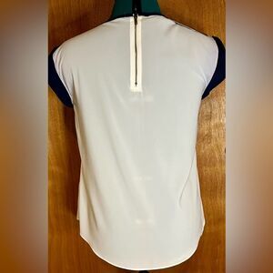 This lovely sheer blouse is white white with navy trim detailing and zipper in the back. 19” Pit to Pit, 23.5” Length