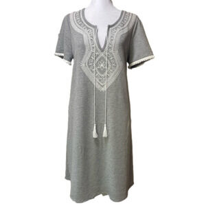 Spense Embroidered Dress Short Sleeve Heather Gray. Easy pullover dress that looks darling with a denim jacket and can even be used as a beach coverup. Heather gray with white embroidery at neckline and chest with tassel ties at neckline and fun tassel detail at sleeves. Super soft, breathable Poly/Viscose/Spandex blend. An easy, breezy, fun addition to your wardrobe!